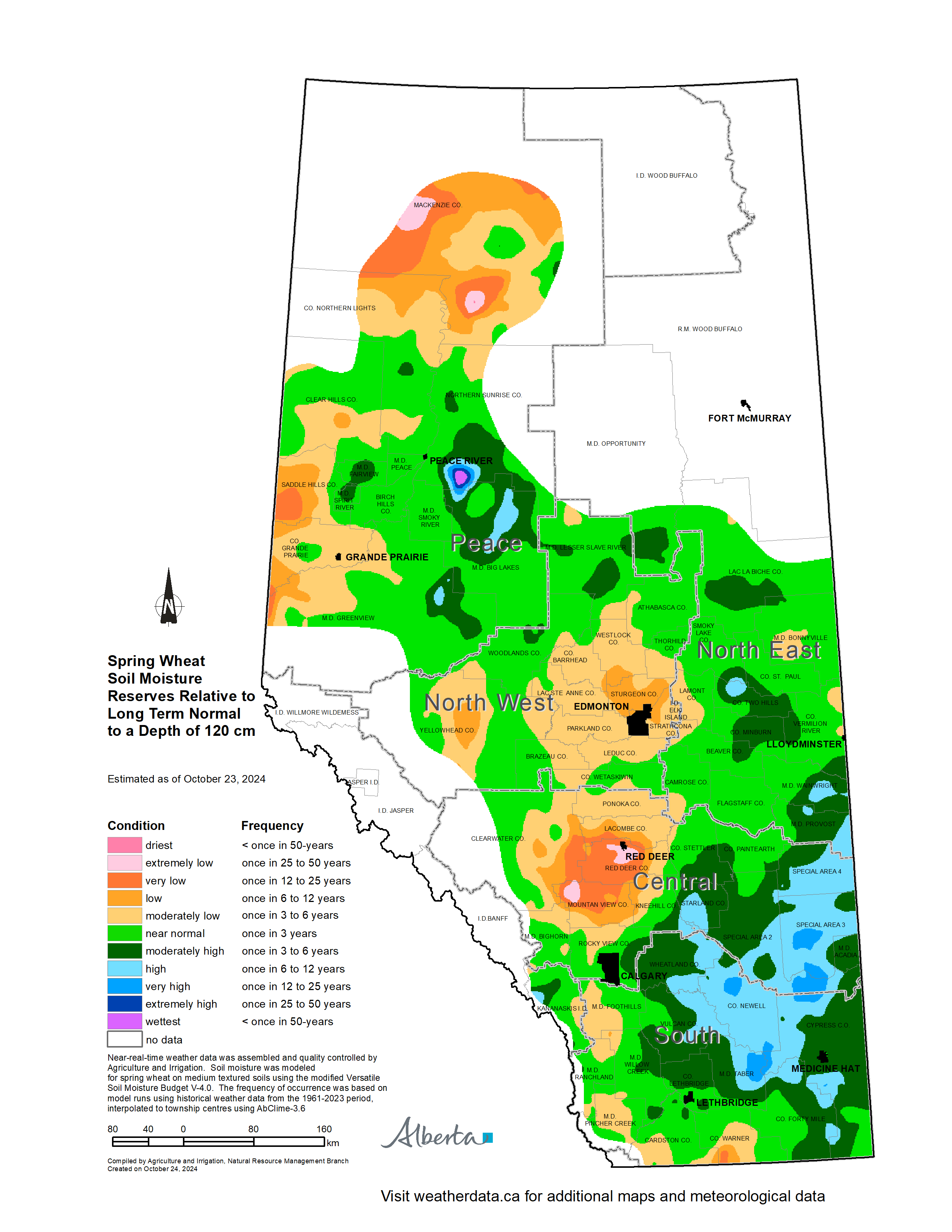 portions of the Peace Region soil moisture reserves ranged from once in 3 to once in 12-year lows.