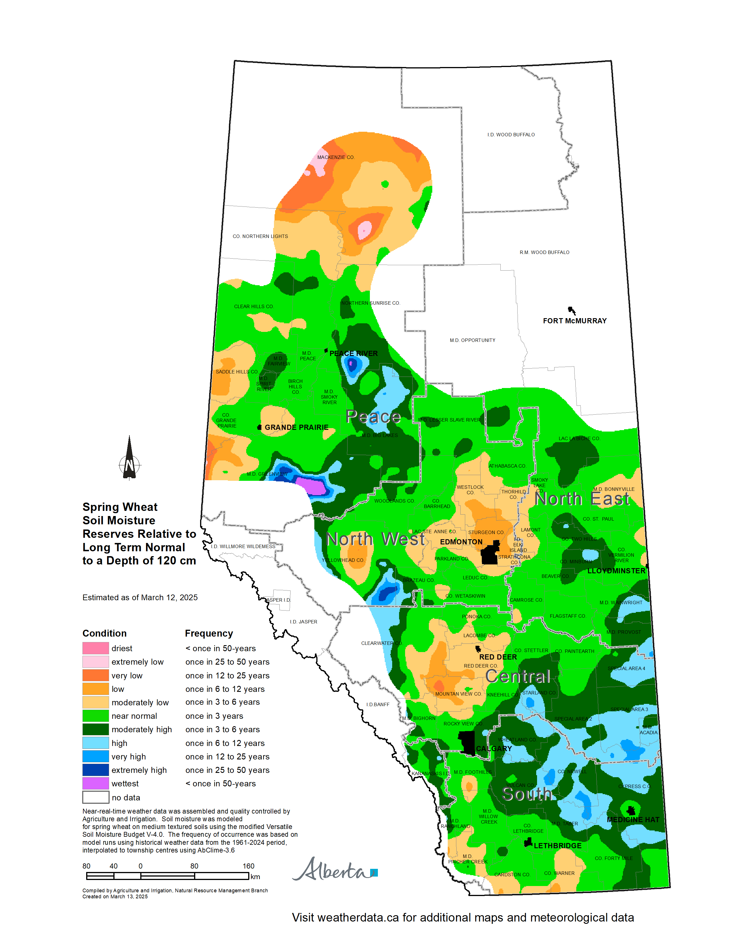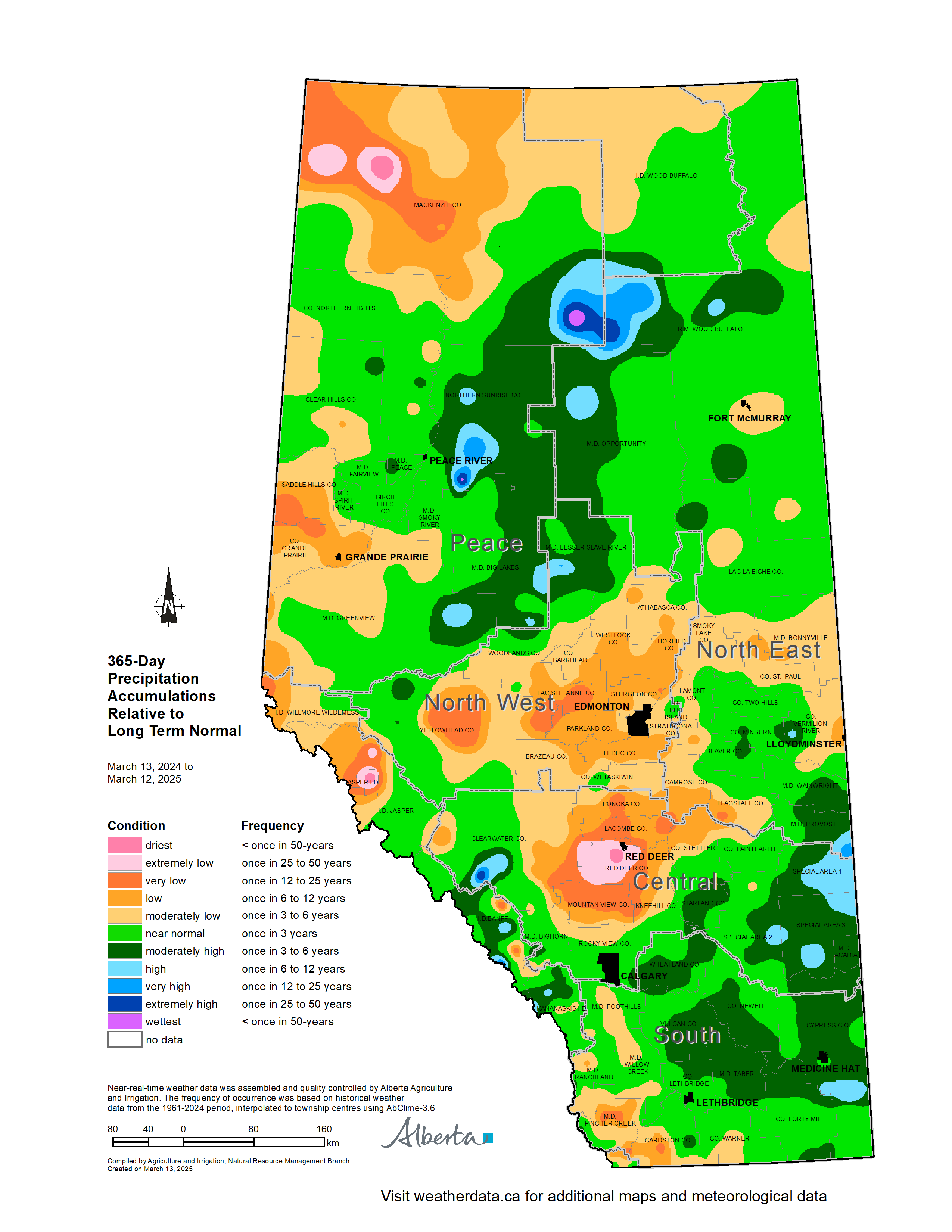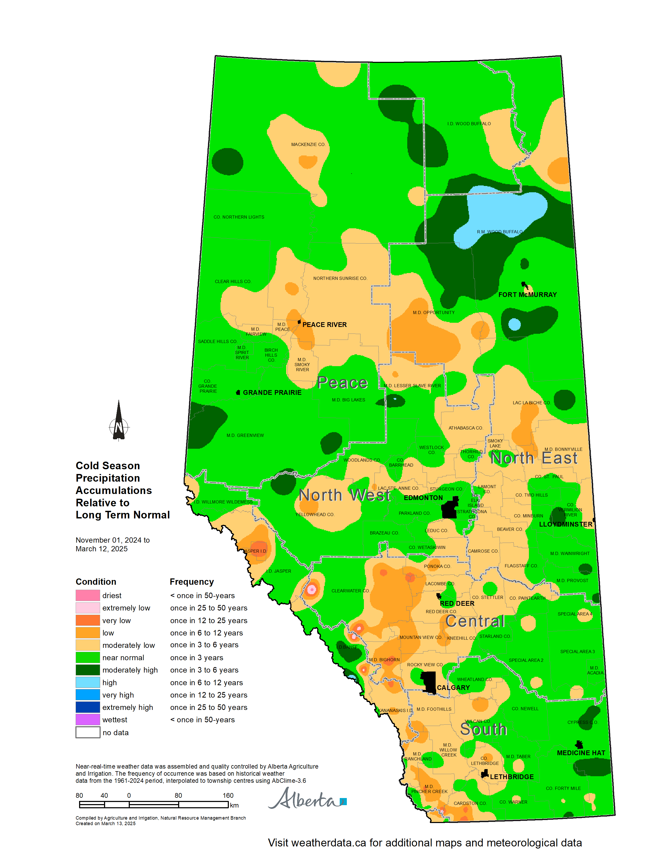 It is important to emphasize that the cold season, on average, is the driest time of the year. Being the relative dry season, even above average moisture at this time of year is typically not enough to make a significant impact on “year-to-date” moisture deficits, nor would they usually be sufficient to create excess moisture conditions. For agriculture, May, June and July remain the most important months for receiving precipitation. The 2025 cropping season is only a few months away. We are beginning to move into what has traditionally been Alberta’s wetter period; there is ample time to receive adequate moisture.